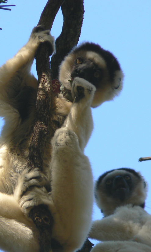 White sifaka (Propithecus verreauxi) are diurnal, group-living, arboreal, folivores. These spectacular creatures are characterized by various fascinating behavioral and anatomical adaptations. I am part of a larger research team that studies the Beza Mahafaly sifaka population from just about every angle, including conservation, genetics, social behavior, hormones, life history, and energetics of movement.